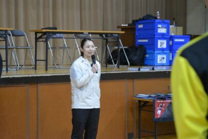 また、本校卒業生である渡部さんからは、競技を続けるうえで大切な姿勢や、日頃の練習で意識するポイントについてアドバイスがありました。生徒たちはトップレベルのプレーを間近で見ながら、熱心に指導を受けていました。
